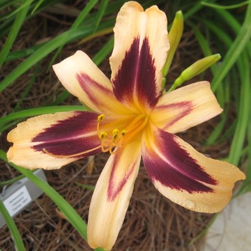 Early, 34” tall, 5” flowers, spider ratio 5.20:1, diploid, evergreen, diurnal.Pink melon with red purple eyezone.