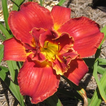 Midseason to late, rebloomer, 22” tall, 5” flowers, double, tetraploid, semi-evergreen, diurnal.Red wine color with lemon throat.